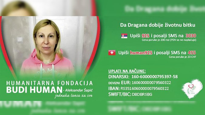 Novac se prikuplja preko Humanitarne fondacije Budi human uplatama na dinarski račun 160-6000000795397-58 ili na devizni račun EUR: 160600000079560322 IBAN: RS35160600000079560322 SWIFT/BIC: DBDBRSBG